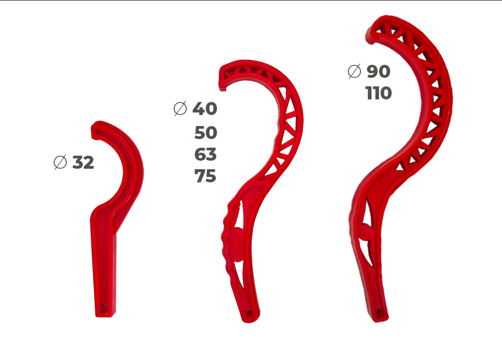 Ключи ТПК-АКВА® спроектированы с учетом особенностей конструкции гаек, что дает гарантированный зацеп зуба ключа с ребром гайки. При разработке ключей одним из главных критериев, принимавшихся во внимание, была эргономичность конструкции. Один ключ ТПК-АКВА® может применяться для монтажа гаек компрессионных фитингов ПНД нескольких диаметров.